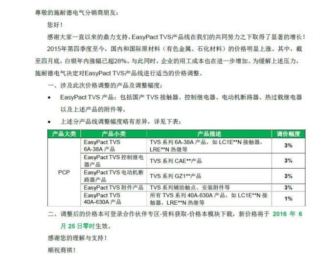 您好,感謝大家一直以來的鼎力支持,EasyPact TVS產品線即將進行適當的價格調整,涉及此次價格調整的產品及調整幅度,詳見下表,新價格將于2016年6月25日零時生效。